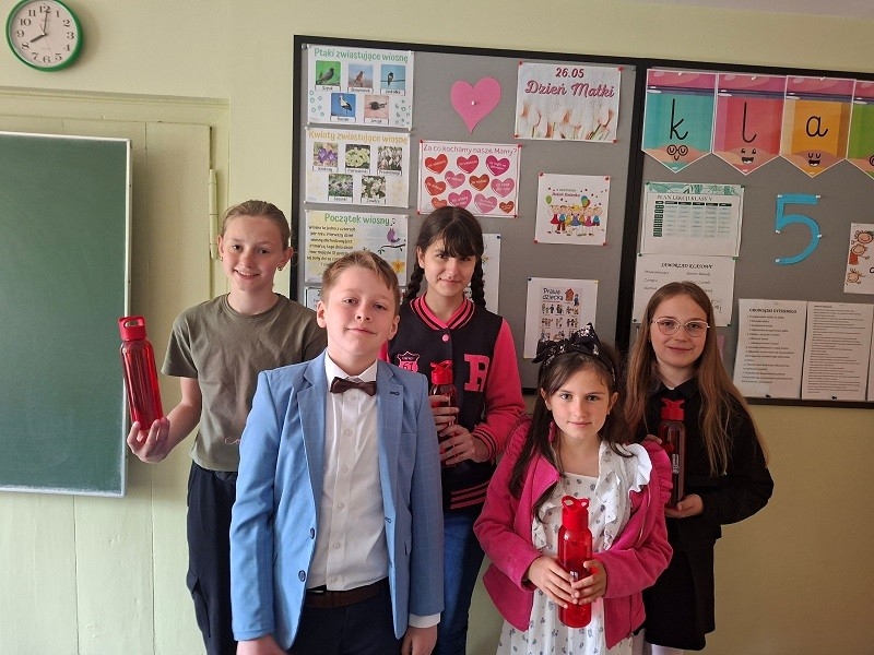 W maju 5 uczniów naszej szkoły otrzymało nagrody za ich systematyczne oszczędzanie w Szkolnej Kasie Oszczędności. Nagrodzeni sportowymi bidonami uczniowie od września uzbierali 20 naklejek w swoich książeczkach oszczędnościowych. Nagrodzeni zostali: Lena z kl. I, Lena i Janek z kl. III, Marta z kl. V oraz Kasia z kl. VI.
