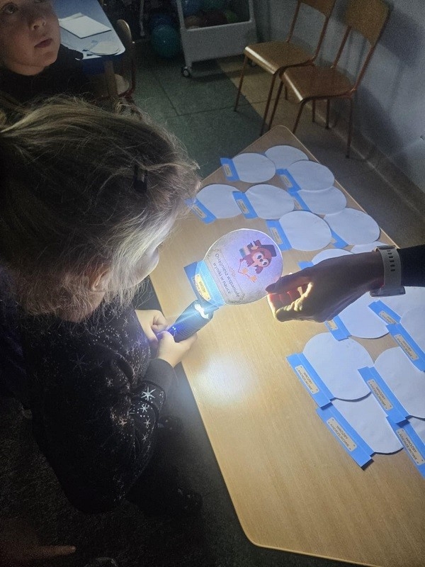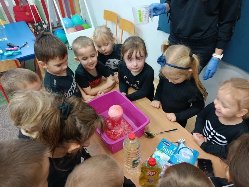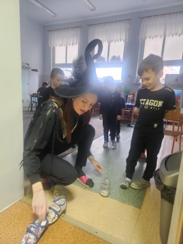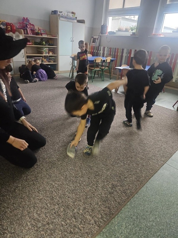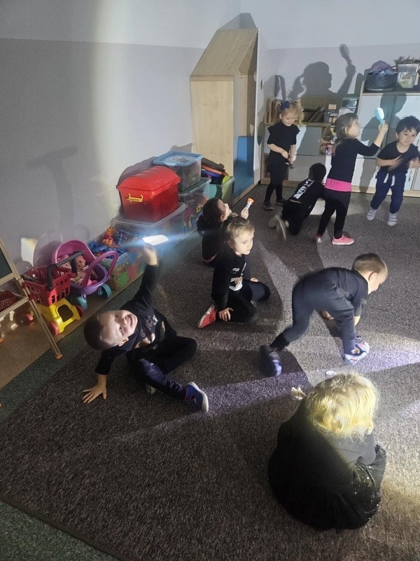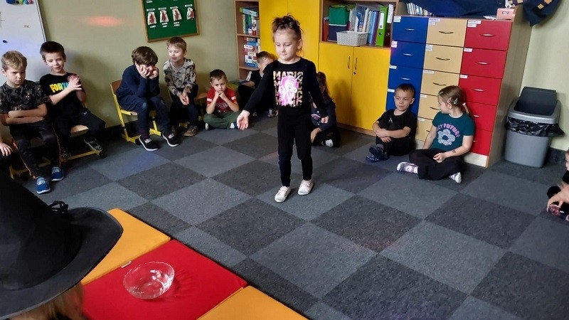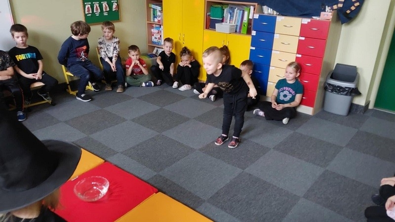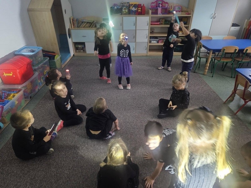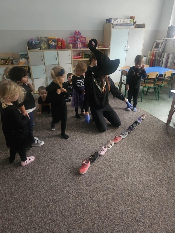 Odbyło się również losowanie magicznych kul. Po podświetleniu latarką dzieciom ukazywała się przepowiednia na najbliższy czas. Nie mogło zabraknąć ustawiania butów w kierunku drzwi. Oczywiście każdy przedszkolak doskonale wiedział, że wróżba jest magią i doskonałą zabawą, dlatego wierzymy w nią, ale z przymrużeniem oka. Całą imprezę uświetniła fantastyczna muzyka oraz słodki poczęstunek. Zabawa andrzejkowa sprzyjała integracji dzieci. Wszyscy wspaniale się bawili, humory dopisywały. Radości oraz śmiechu było wiele. Dziękujemy wszystkim za wspaniałą zabawę.