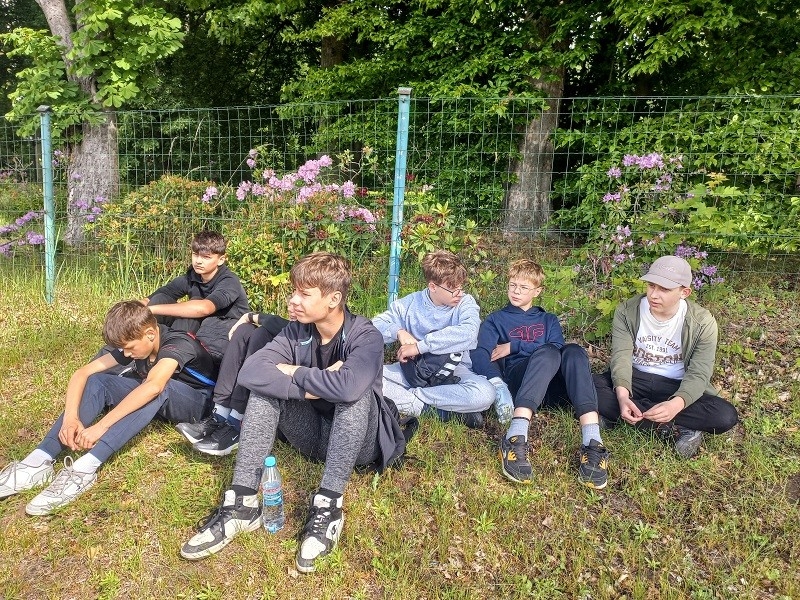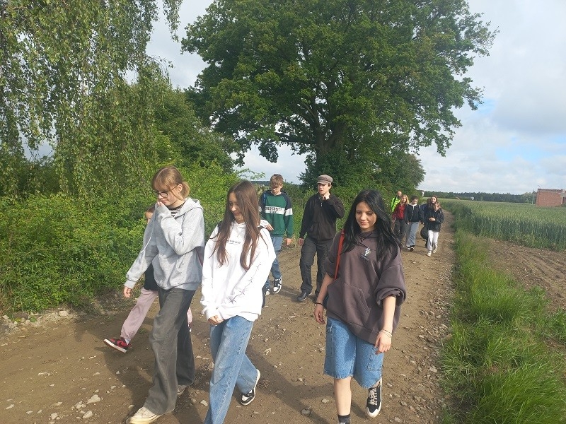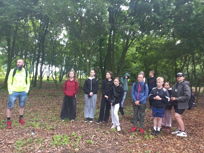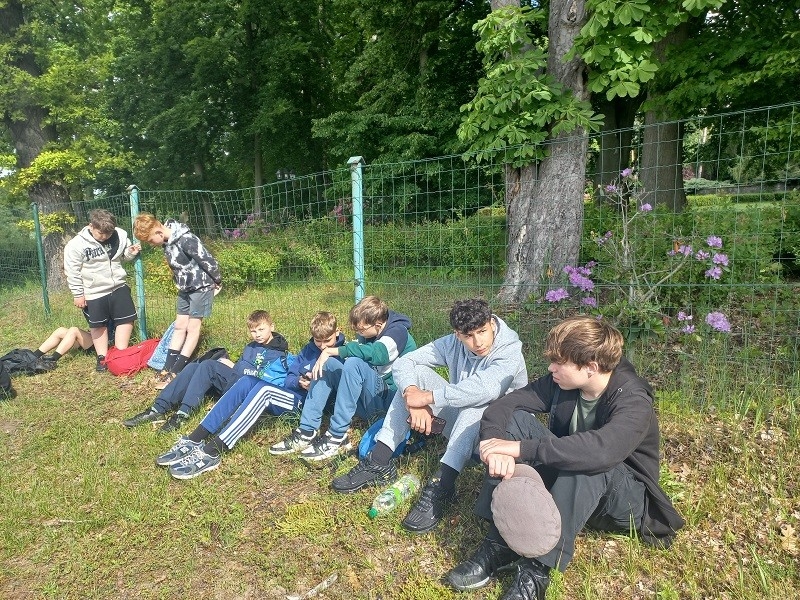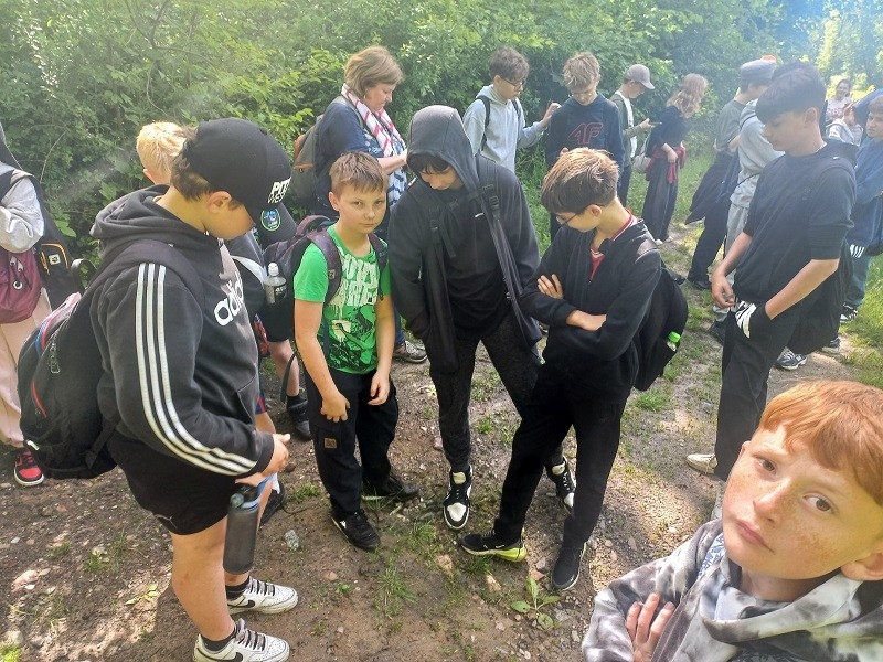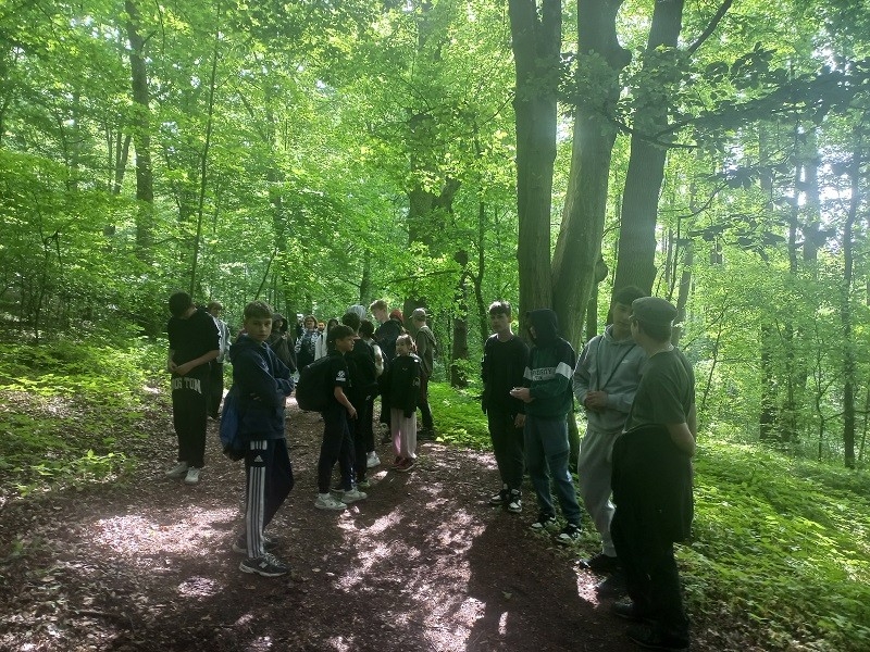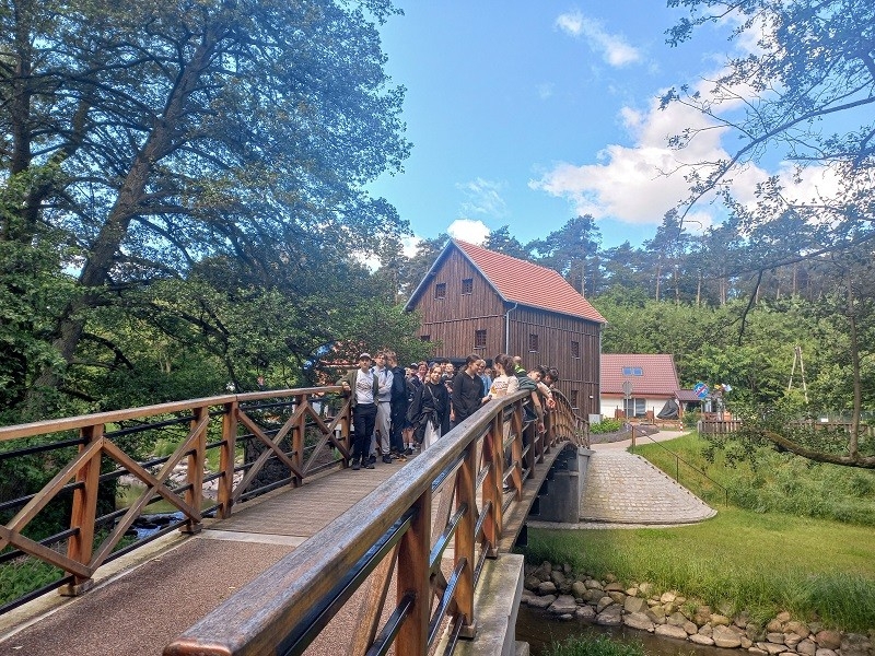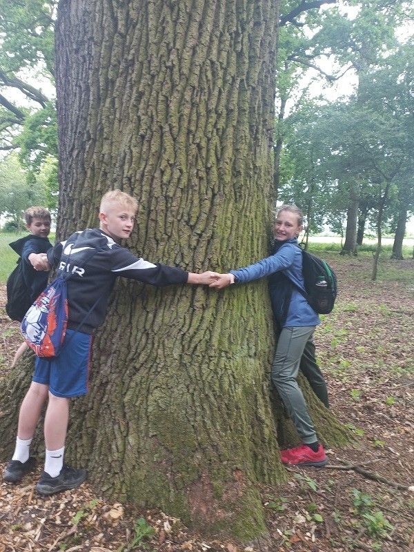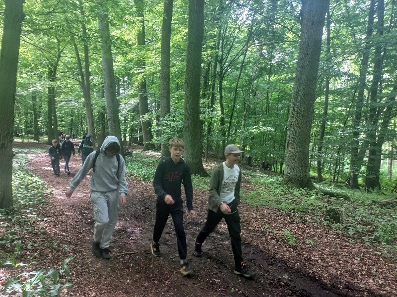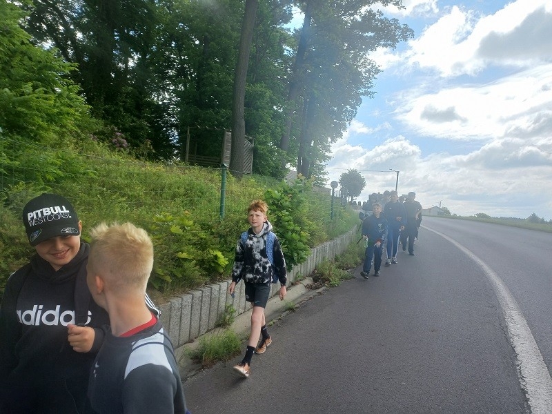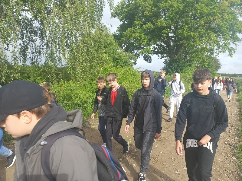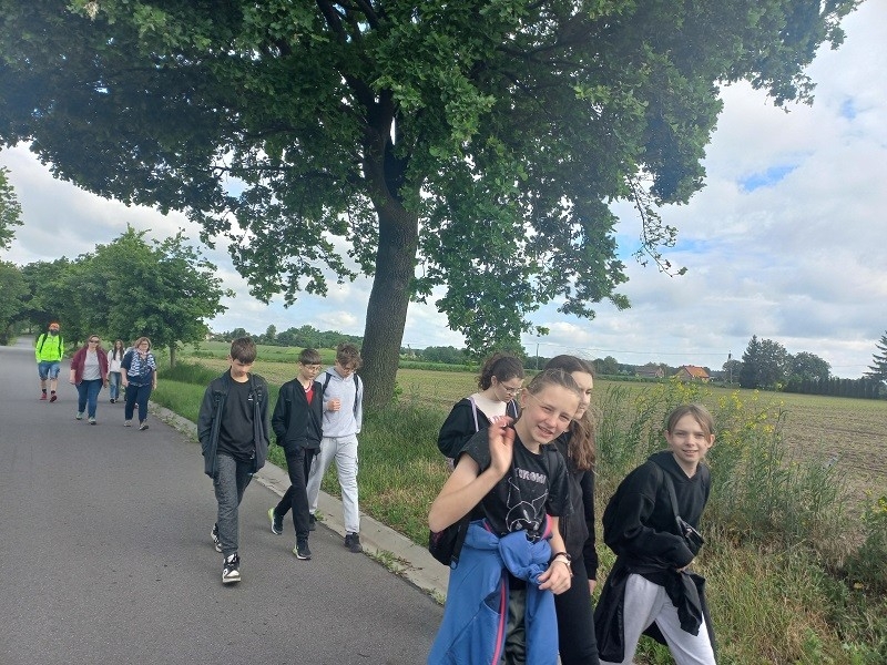 Następnie udaliśmy się do Woli Książęcej, gdzie wysłuchaliśmy ciekawostek o pałacu w Słupi. Po krótkim odpoczynku udaliśmy się leśną drogą, wiodącą wzdłuż Lutyni i przez urokliwe polany. Śpiew ptaków, obcowanie z naturą sprawiło, że mimo przebytych kilometrów, ochoczo podążaliśmy do głównego celu naszej wyprawy - Młyna nad Lutynią w Wilkowyi. W młynie mieliśmy okazję usłyszeć jego historię i zobaczyć jak kiedyś działał młyn, który obecnie jest uważany jako jeden z najcenniejszych zabytków i obiektów turystycznych Ziemi Jarocińskiej. Na strudzonych wędrowców czekał również słodki poczęstunek oraz pokaz gry na dudach. Po regeneracji sił na pobliskiej łące, wróciliśmy do szkoły.