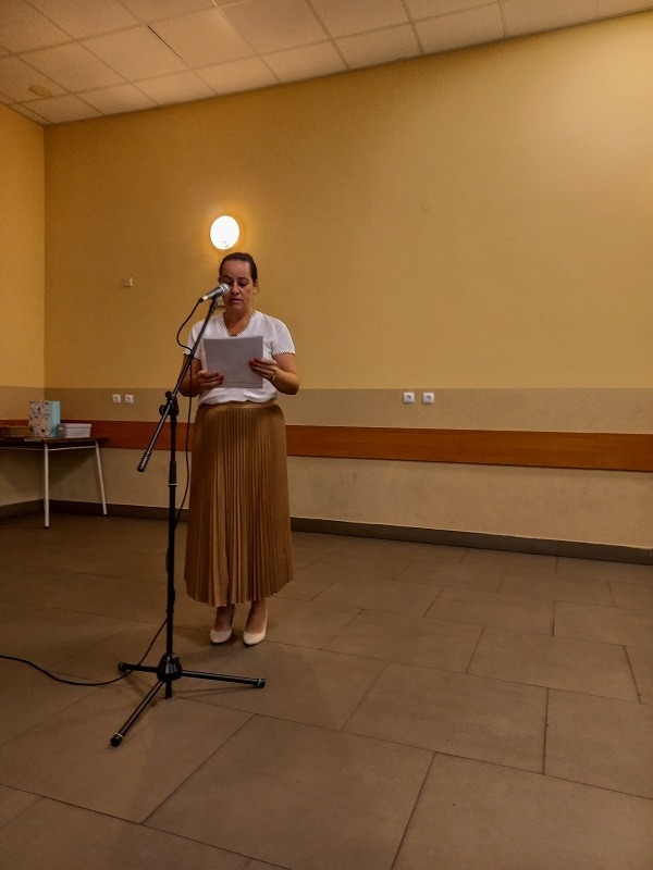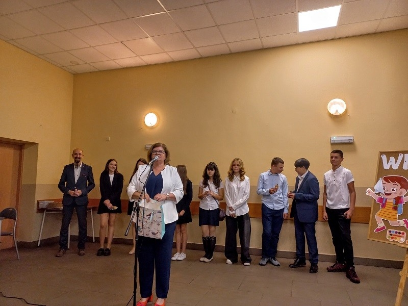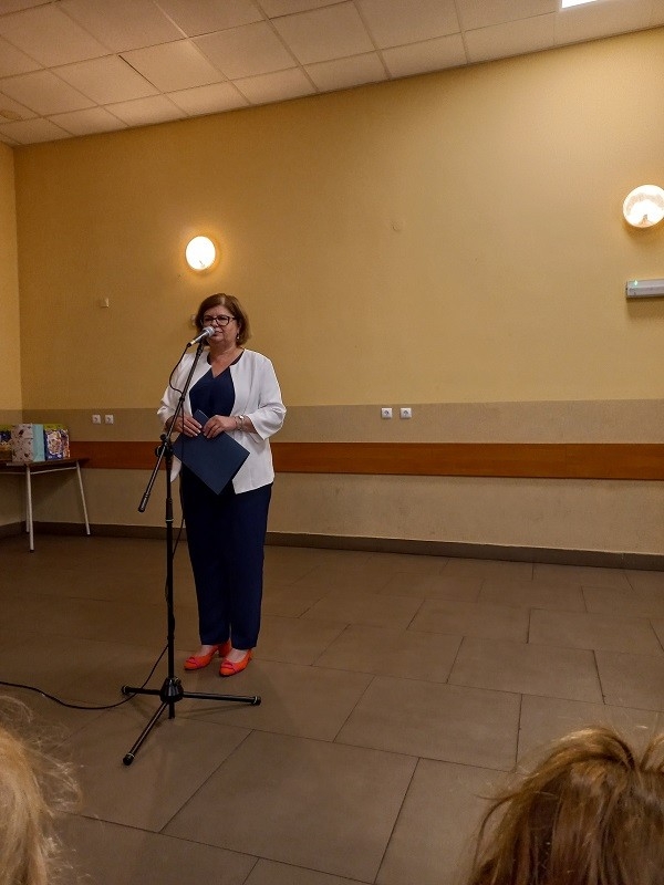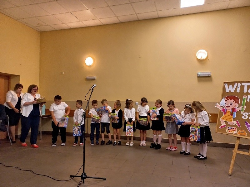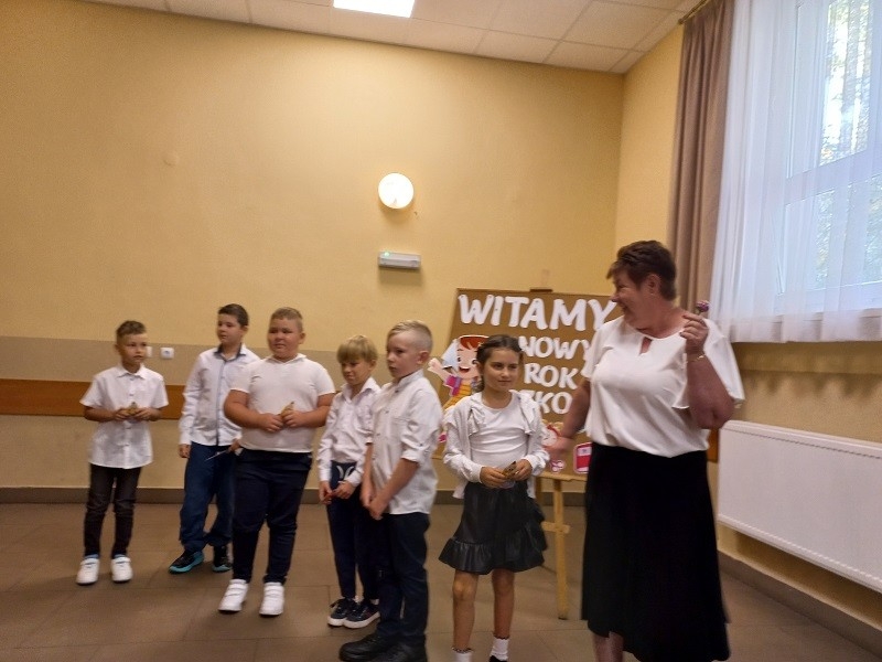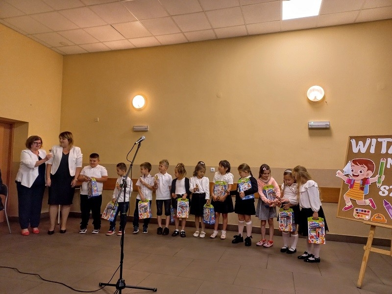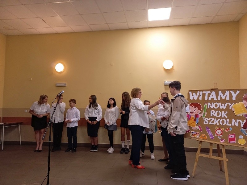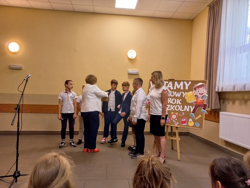 Po występach głos zabrała Pani Dyrektor Beata Fengler, która powitała wszystkich zgromadzonych. Pani Beata pierwsze słowa skierowała do nowych uczniów, czyli do pierwszoklasistów, których serdecznie powitała w murach naszej szkoły. Następnie zaprosiła dzieci z klasy pierwszej na scenę, aby rozdać im prezenty - wyprawkę szkolną. Po pierwszoklasistach przed społecznością szkolną wystąpili uczniowie wszystkich klas wraz z wychowawcami i otrzymali słodki upominek od pani Dyrektor. Później pani Beata poinformowała o zmianach oraz najważniejszych informacjach dotyczących nowego roku szkolnego oraz przedstawiła nowego nauczyciela. Następnie przekazała głos pani Kirze Andrzejewskiej, która odczytała list od Pani Urszuli Wyremblewskiej-Korzyniewskiej - Burmistrza Jarocina.