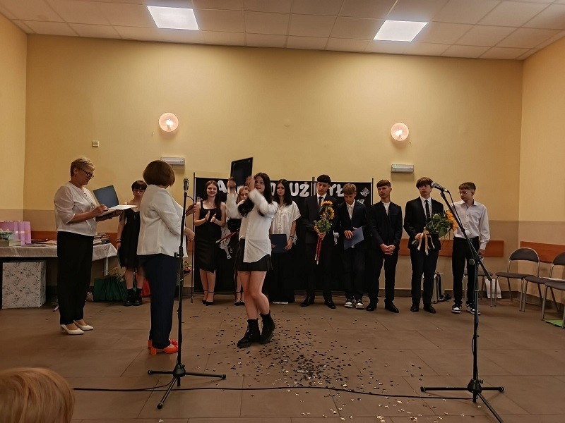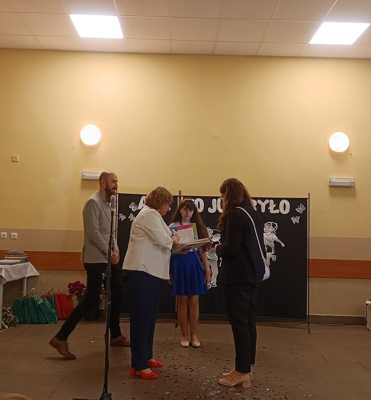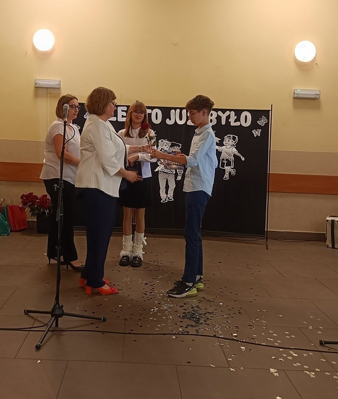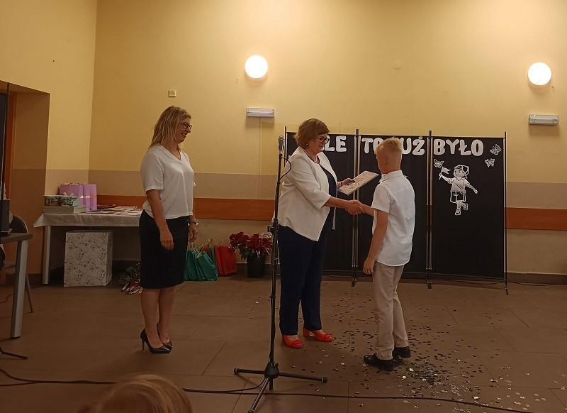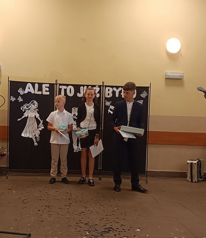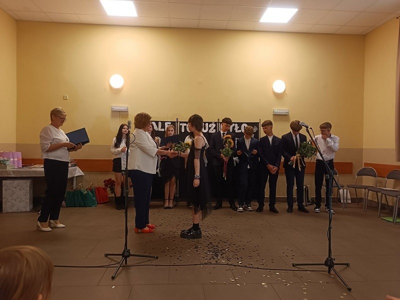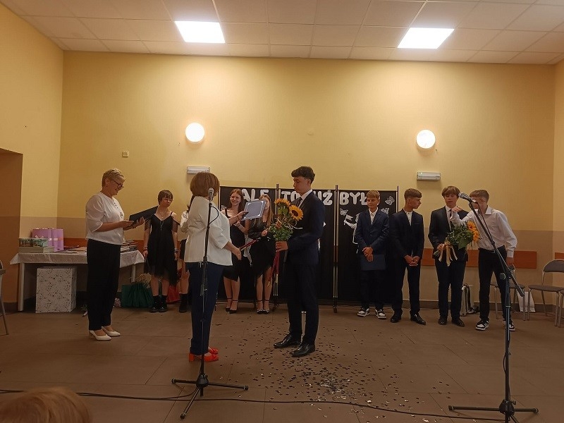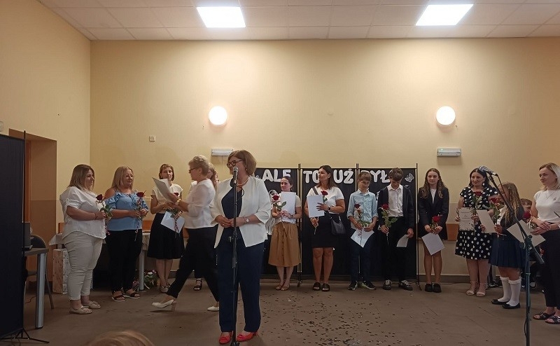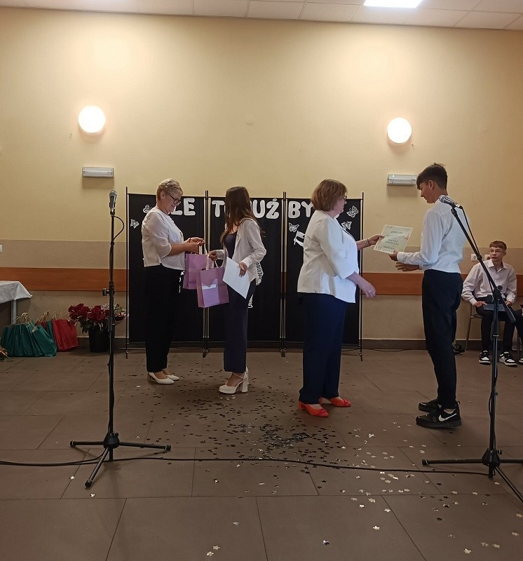 Po części artystycznej pani Dyrektor rozdała uczniom klasy ósmej świadectwa, wręczyła dzieciom nagrody książkowe, złote i platynowe laury, dyplomy za czytelnictwo, wzorową frekwencję, pracę w Samorządzie Uczniowskim, udział w kołach zainteresowań, najlepszego kolegi i najlepszej koleżanki oraz list gratulacyjny dla rodziców uczniów, którzy przez wszystkie lata otrzymywali świadectwo z wyróżnieniem. Podziękowania otrzymali również rodzice, którzy zaangażowali się w pomoc na rzecz szkoły i dzieci.